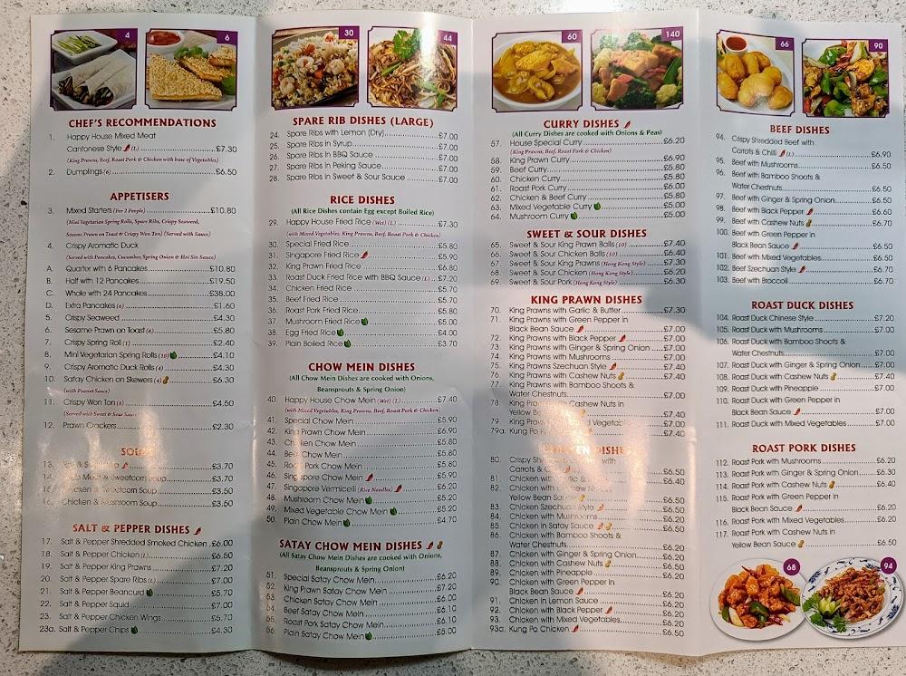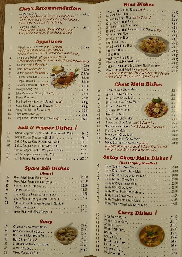 Happy House has an extensive menu that showcases a delightful blend of Chinese cuisine and British favorites. Start off with crisp appetizers like the Emperor's Delight and mini vegetarian spring rolls. The chow mein section is particularly generous, featuring options like King Prawn Chow Mein and Special Chow Mein, perfect for noodle lovers. For rice enthusiasts, dishes such as Happy House Fried Rice and Special Fried Rice provide hearty meals in themselves. The curry selection, including the King Prawn Curry and Happy House Curry, is equally enticing. This eatery also offers various beancurd, beef, and vegetable dishes, ensuring there is something for everyone. Don't overlook their unique twists on traditional Chinese offerings, such as Sweet & Sour Chicken Balls and crispy aromatic duck, which make the menu both diverse and memorable.